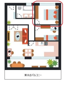 赤枠で囲われた部屋が寝室です。寝室は朝日が入ることがないので、朝に眩しくて起こされる心配が少ないです。