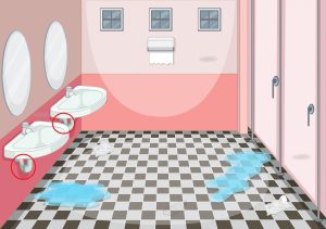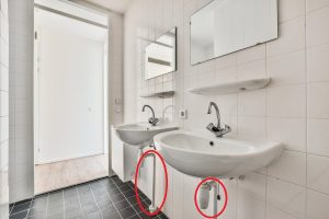 下の写真の赤丸のように排水が床に向かっている場合は床排水です。