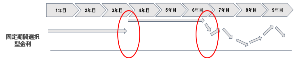 最初に選択した固定金利期間以上は低い固定金利の選択ができない。結果的に全期間固定金利を選ぶのが支払は安心感があることも考えられる。